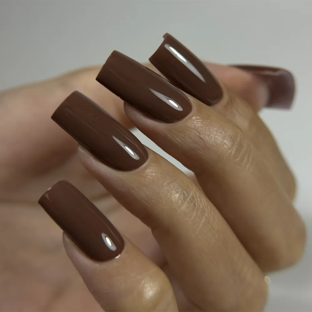 Ciepły, orzechowy brąz – głęboki i elegancki odcień, który doskonale wpisuje się w jesienno-zimowe stylizacje. To kolor pełen klasy, idealny dla kobiet ceniących ponadczasowe barwy w manicure. Świetnie prezentuje się zarówno solo, jak i w połączeniu ze zdobieniami w złocie czy beżach.